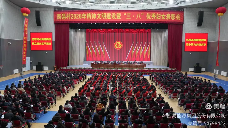 人間三月春風(fēng)暖,巾幗建功綻芳華。2026年3月7日,西易村在村文體活動中心召開2025年度精神文明建設(shè)暨紀(jì)念“三八”婦女節(jié)表彰大會,西易村黨委書記、村委會主任,西易能源集團(tuán)公司董事長兼總經(jīng)理苗杰出席會議,村兩委委員、公司領(lǐng)導(dǎo)、四大中心負(fù)責(zé)人、各單位副職及以上領(lǐng)導(dǎo)干部、村民代表、女職工代表、精神文明建設(shè)受表彰人員共450多人參加。會議由村黨委委員、公司常務(wù)副總經(jīng)理苗天明主持。